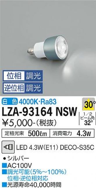 [機能/他] LED 4.3W(E11) DECO-S35C 白色 4000Kシルバー■AC100V■調光可能(5%~100%)位相・逆位相対応■光源寿命40,000時間定格光束 500lm消費電力 4.3WRa831/2ビーム角 32°